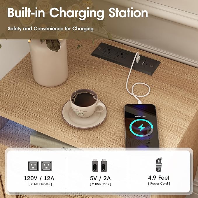 • 【Aesthetic Furniture】Combining classic and modern styles, this oak-toned bedside table with rattan-decorated drawers exudes a natural bohemian vibe. The hand-woven rattan and light luxury metal handle bring a perfect visual effect, and the LED light strips with 25 color modes, 6 speed modes, and 6 brightness modes add color to your life.