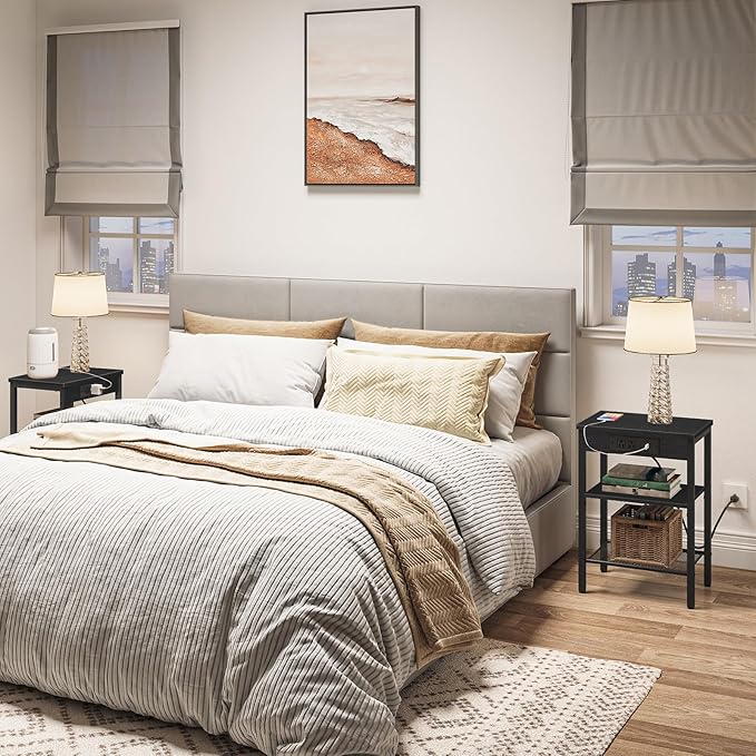 HOOBRO End Table with Charging Station and USB Port, 3-Tier Nightstand with Adjustable Shelf, Small Side Table for Small Space in Living Room, Bedroom and Balcony, Black BB112BZ01