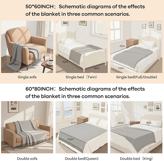 • 【HOW TO CHOOSE THE RIGHT COLOR AND SIZE】: The color visual effect of the product may vary slightly under different displays and light conditions. The blanket is tightly rolled up for packaging. After receiving it, it is recommended to let it stand for a few days or wash it, which can help it quickly return to its normal size. Meanwhile, the product is made by knitting, so the blanket will have a certain degree of elasticity. A measurement error of 1-2 inches is a normal phenomenon.