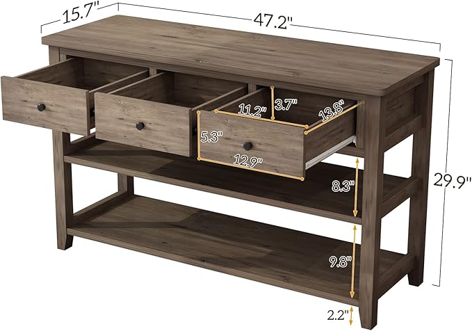 • 【Ample Storage Space】Measures 47.2"L x 15.7"W x 29.9"H. Come with 3 drawers and 2 tiers of open shelves, it provides you with a lot of storage space. Three drawers offer you extra space for keys and coasters and keep the desktop tidy. The 2 bottom shelves are perfect for displaying vases, plants, storage boxes, etc