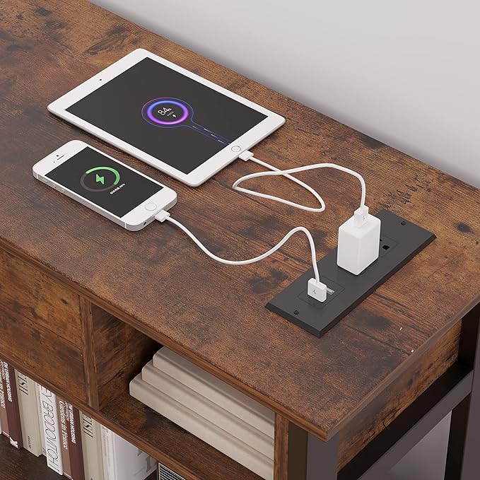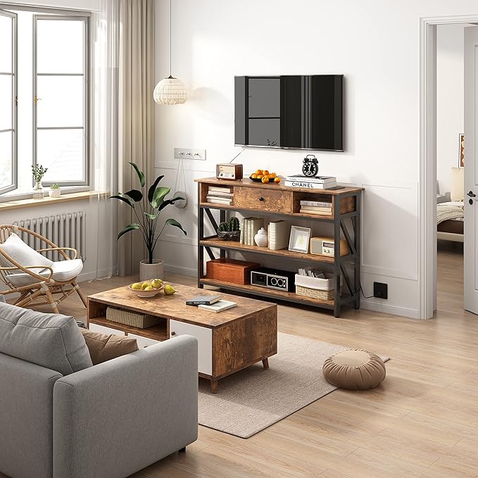 Mexin 47 Inch Console Table with 2 Outlet and 2 USB Ports, Entryway Table with Drawer and Storage Shelves, Narrow Sofa Table for Living Room and Hallway, Vintage Brown