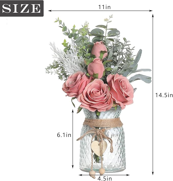 • Artificial flowers in a vase: includes five silk roses, artificial eucalyptus, Flocked Lambs Ear, fake plants and vases. The glass vases are decorated with heart and globe pendants and twine. The perfect combination of bouquets and vases, the rustic style is perfect for farmhouse decorations, coffee table decorations, and dining room centerpieces.