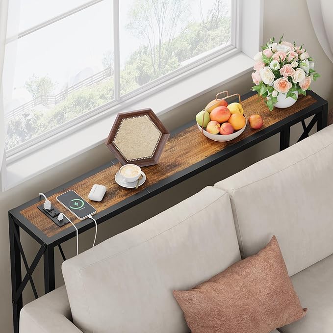 41.8" Console Table, Narrow Behind The Couch Table with Outlet, Industrial Skinny Stand for Hallway, Entryway, Living Room, Bedroom, 6.5 Feet Power Cord,Rustic Brown