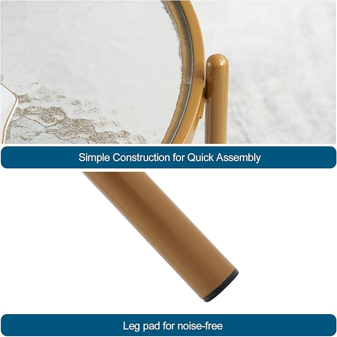 • 【Unique Water-wave Texture】The water-wave texture glass top and metal frame give this coffee table an elegant and modern look that will complement any decor style. The glass top's texture adds a subtle touch of sophistication and prevents fingerprints or smudges from showing up, making it easy to maintain. The circular shape of the metal frame gives the table a unique and eye-catching silhouette.