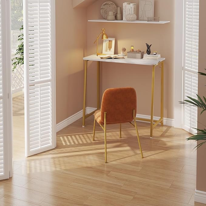 WOHOMO White Faux Marble Folding Desk, 31.5" Small Desk for Small Spaces with Gold Legs, Easy Assemble Foldable Computer Desk, Mini Portable Working Table for Home Office, White and Gold