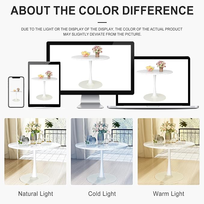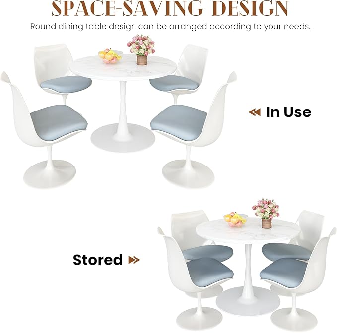 • 【Round Tulip Dining Table】: This small dining room table has a modern mid-century style, with a unique faux marble look and sleek silhouette leading to a minimalist lifestyle. The elegant round dining table has a stylish silhouette and can be used as a breakfast table, coffee table, living room table, casual tea table and outdoor dining table.