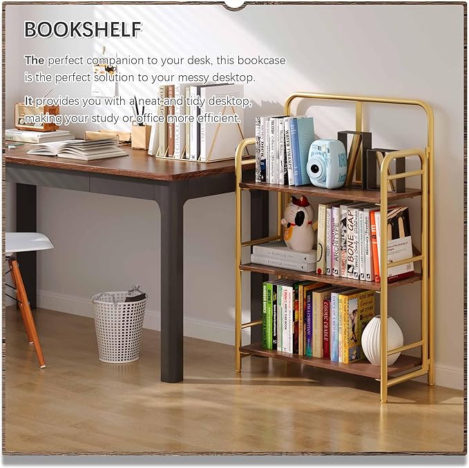 4NM No Assembly Folding Bookshelf, 3 Tiers Collapsible Book Shelves Open Industrial Foldable Storage Bookcase Shelf for Bedroom, Living Room, Home Office - Brown and Gold