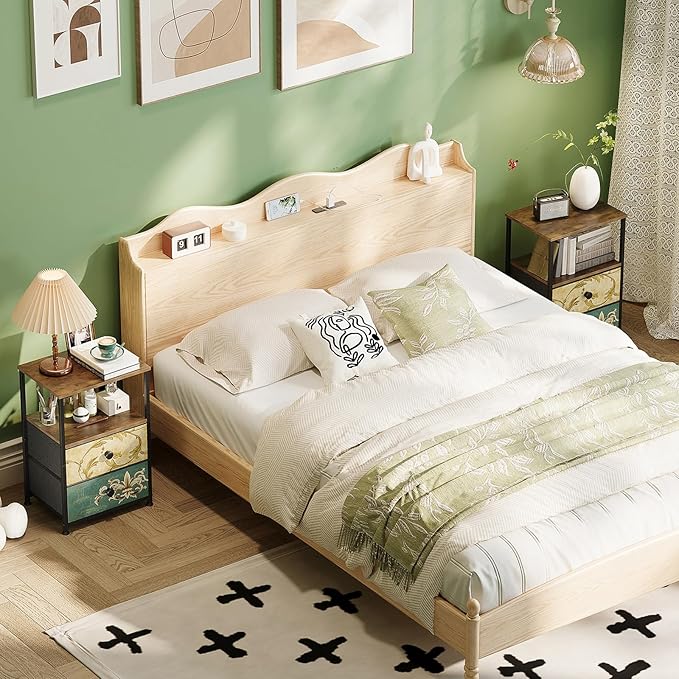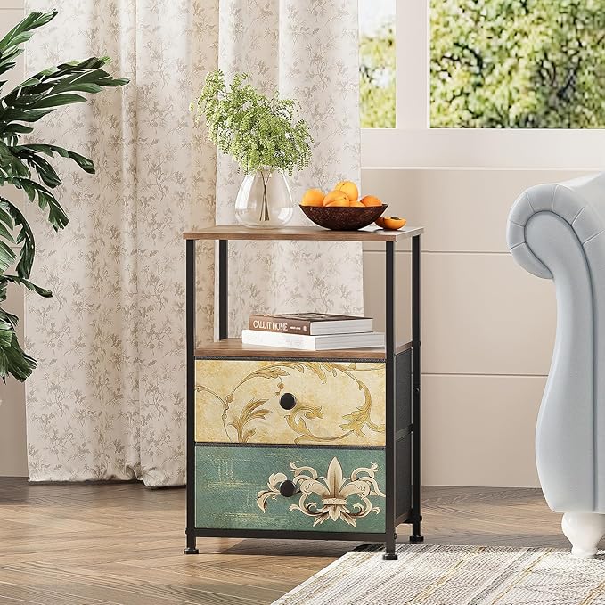 Tohomeor Nightstand with 2 Fabric Drawers Retro Flower End Table Side Table with Open Storage Shelf for Bedroom Living Room Sofa Beside Vintage