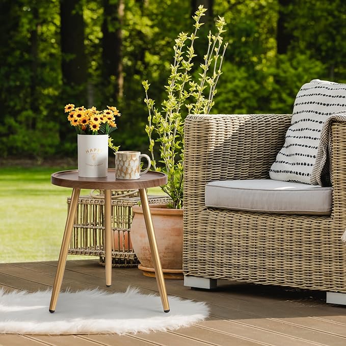 danpinera Round Side Table, Metal Legged Accent Table with Wooden Tray, Small Round End Table for Living Room, Bedroom, Nursery, Brown & Gold