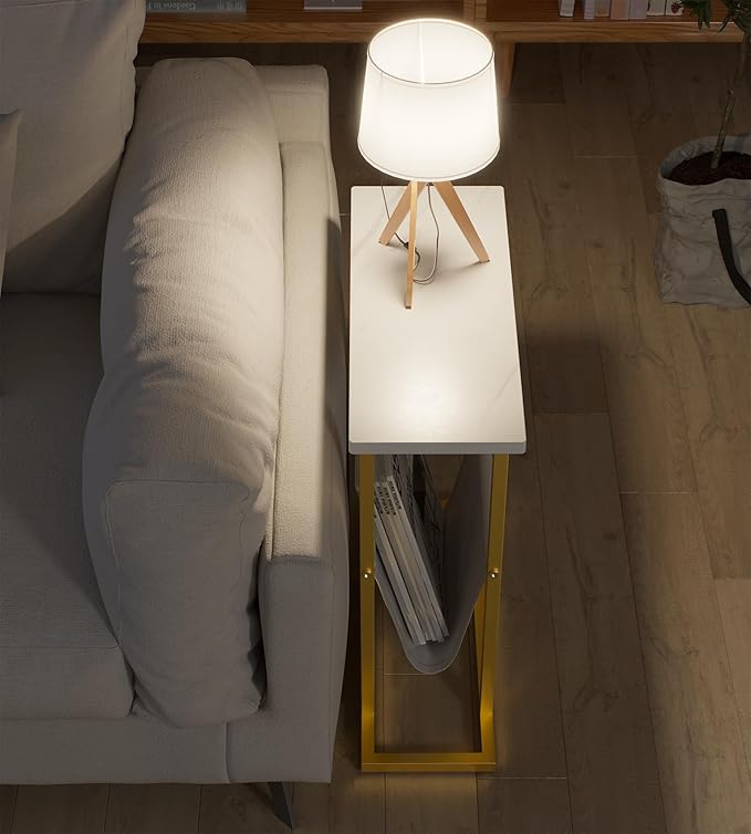 Yusong Small Narrow Side Table for Small Spaces, 17.7" W Slim End Table Magazine Table Nighstand with Storage Holder, Accent Skinny Snack Couch Bedside Table, Gold White, Complete Iron Pipes