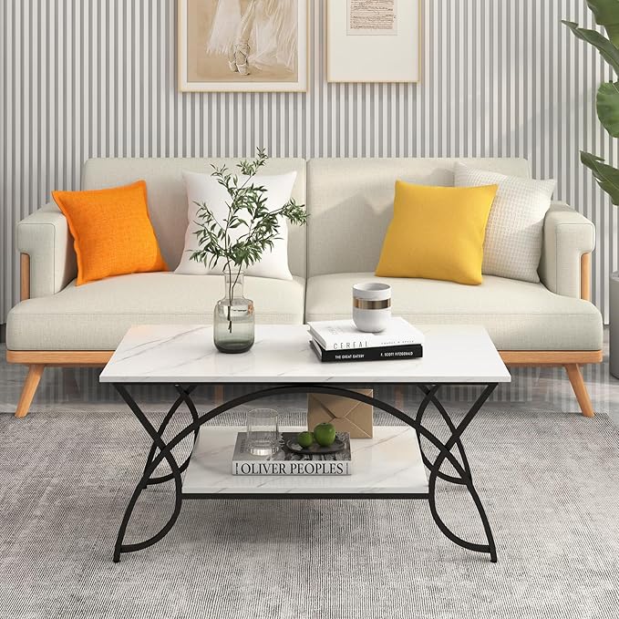 Giantex 2-Tier Rectangular Coffee Table, Faux Marble Table with Open Storage Shelf, Black Finished Metal Frame, Modern Center Table for Living Room, Reception Room (White+Black)