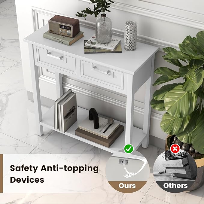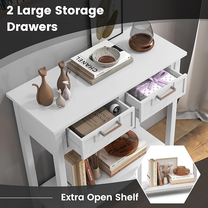 • [Ample Storage Solutions]: Featuring a practical bottom shelf and 2 drawers, this foyer table offers abundant storage space. The bottom shelf is ideal for storage bins or potted plants, while the tabletop accommodates essentials like your coffee maker, mugs, and decor. Additionally, the drawers are perfect for organizing personal items.