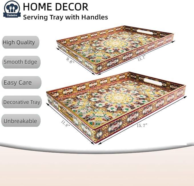 • Product Details: This set includes two serving trays, each with a different size. The first tray measures 13.7" x 9.8" x 1.4", while the second tray measures 15.7" x 11.8" x 1.6". These varying sizes offer versatility for different serving needs and aesthetics, ensuring that you have the perfect tray for any occasion.