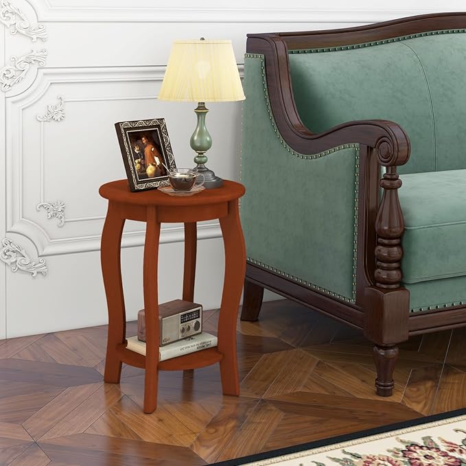 Giantex Round End Table, Wooden Side Table with Storage Shelf, Small Nightstand with Solid Wood Legs, 2-Tier Accent Table for Living Room Bedroom (1, Walnut)