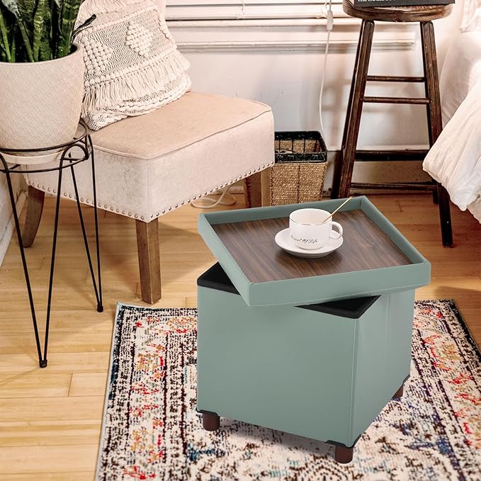 • Multi-functional: Coffee Table Ottoman with tray for living room. The reversible cube storage Ottoman with tray is great. The function of the stool is not just storage, when ottoman flip top tray, the stool turns into a upholstered storage ottoman coffee table in seconds! When used as a coffee table, it is best to stagger the lid over the top of the storage box so that when the stool is touched, the lid and the items placed on top will not fall off. You can also put books, magazines, flowers, decorations, cell phones, TV remotes etc on the small coffee table of the stool, which is both nice and practical.