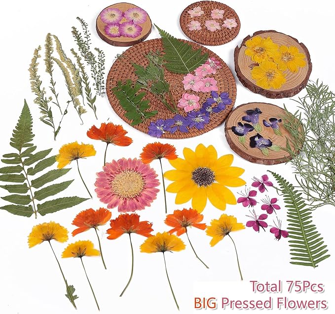 • Bigger than Ever: A4 size packaging with large vibrant pressed flowers, perfect for a wide range of DIY projects, such as 12" photo frames,large trays resin mold, and wooden furniture surfaces. The dried flowers for crafts includes 18 varieties with over 75 pieces in total.