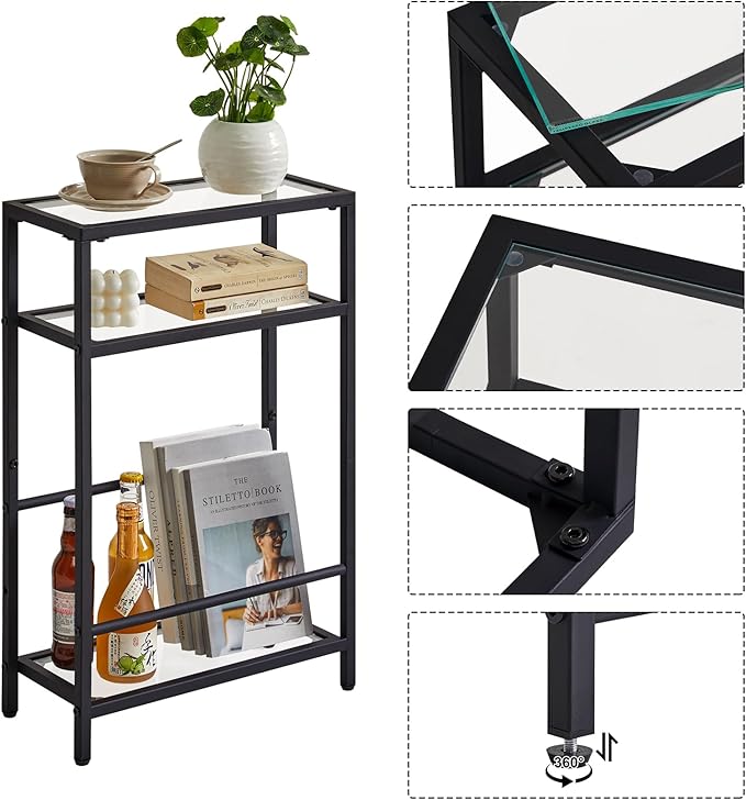 • 【Sturdy Structure 】The three-tier coffee table is made of glass top and rust-resistant square tube frame, which is sturdy; the steel tube underneath can be adjusted to place whatever you want. The sturdy metal frame with black rust-resistant finish makes this coffee table a nice piece of furniture for your home.