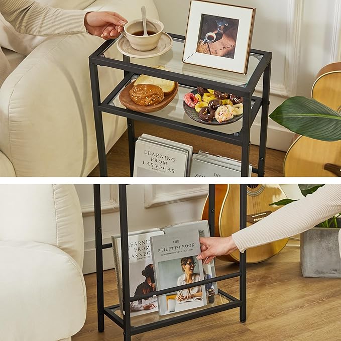 • 【Modern and stylish look】The combination of a clear glass top and black painted metal makes it blend in perfectly with your existing interior home style. This narrow side table can be used as a table side table next to your sofa or as a simple storage unit that looks elegant and adds a nice touch to your home.