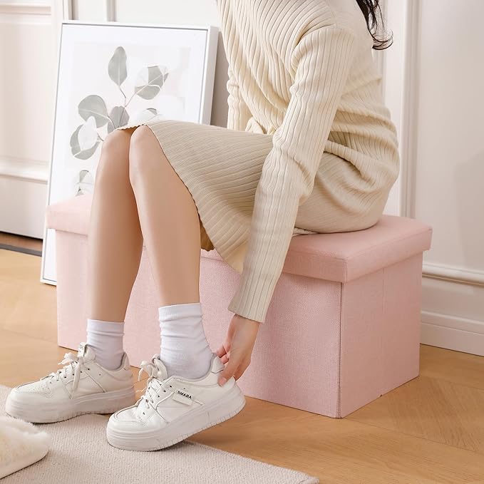 CUYOCA Storage Ottoman Bench Foldable Seat Footrest Shoe Bench End of Bed Storage with Flipping Lid, 75L Storage Space, 30 inches Linen Fabric Pink, OT026PK