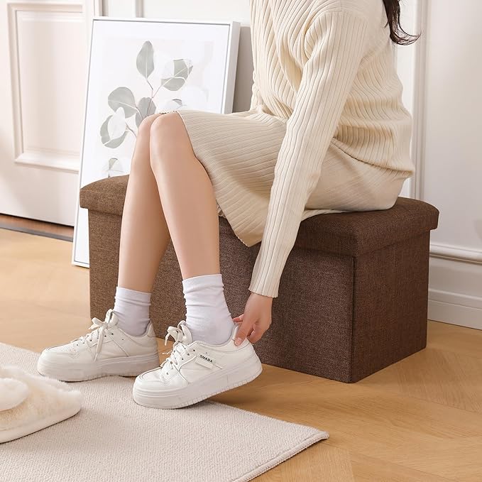 CUYOCA Storage Ottoman Bench Foldable Seat Footrest Shoe Bench End of Bed Storage with Flipping Lid, 75L Storage Space, 30 inches Linen Fabric Brown