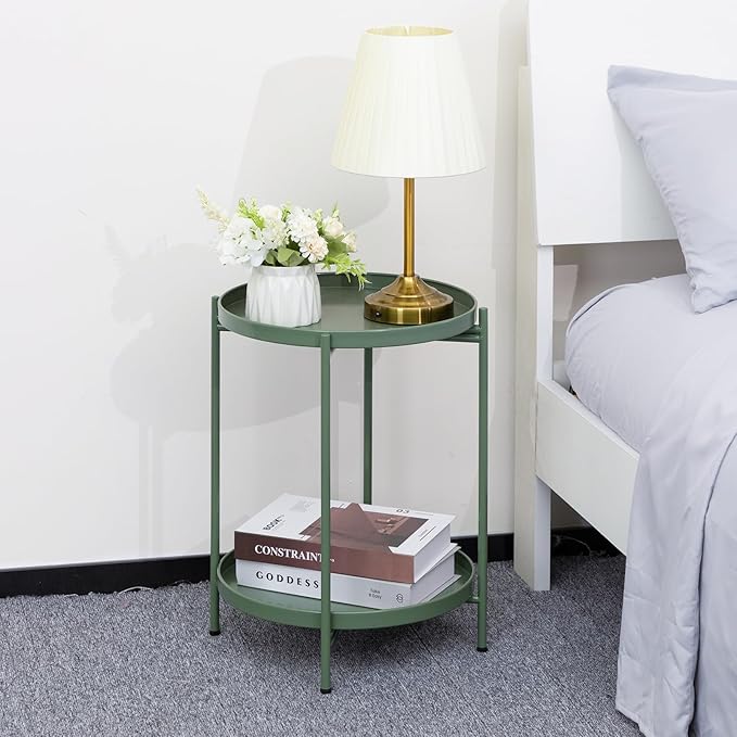 HollyHOME 2-Tier Round Side Table, Outdoor Small Folding Accent Stand with Removable Tray, Anti-Rust Metal Asional Table for Balcony Patio Living Room, Nightstand for Bedroom(Matcha Green)