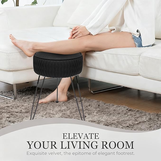 Velvet Vanity Stool Footrests, Round Ottoman Vanity Chairs with Anti-Slip Feet, Dressing Table Seat Foot Stool with Black Legs, Furry Padded Seat Side Table for Makeup Bedroom, Black