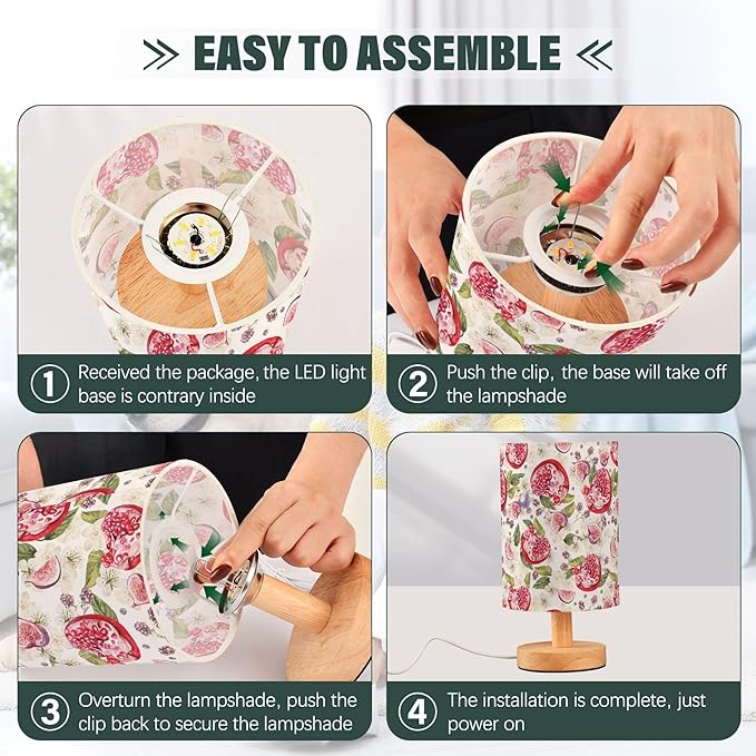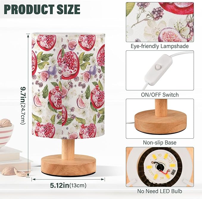 Table Lamp Watercolor Pomegranate BlackBerry Fig Fruit with Flower Pattern Nightstand Lamp with Wood Base Fabric Lamp Shade Bedside Desk Lamp for Living Room Bedroom Kids Room Office