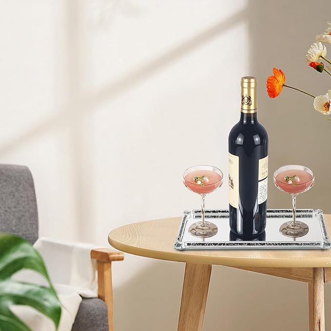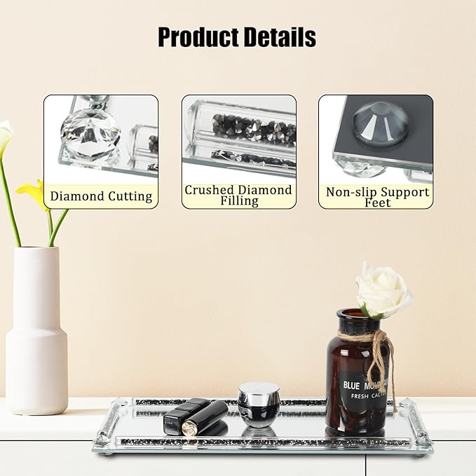 • [Excellent Material] - This perfume tray is made of crystal glass material,rectangle shape fill with crushed diamond for four sides.The surface of the tray is mirror that looks smoothly and brightly.On the bottom there are four anti-slip rubbers,it helps you to prevent from scratching the surface of the table that you place on.