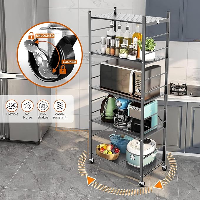 • 360°Movable Shelves for Storage: Portable 5 shelf storage rack has 4 upgraded wheels (2 wheels have locking function). You can move the Holds 2200 pounds kitchen shelves organizers and storage to any position you want, and move quietly.