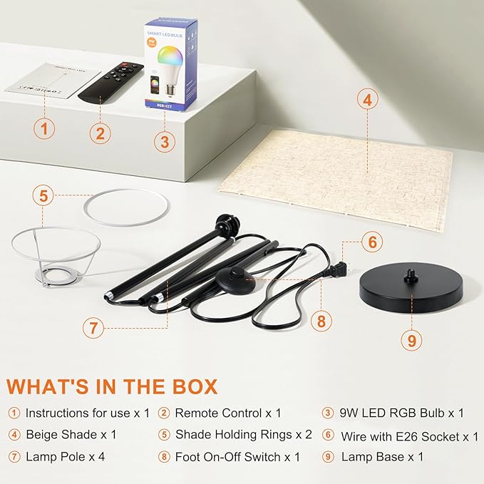 • 【Dynamic RGB Mode】To use this RGB floor lamp, start by turning it on with the foot switch. After that, you can control it with either a remote or a smartphone app. The bedroom floor lamp offers 16 million colors to choose from, and you can easily adjust the brightness and color modes. The floor lamps for living room also includes a 30-minute timer feature,which you can set using the remote (Battery not included) or the app. (PS:App isn’t compatible with Alexa, NO Battery)