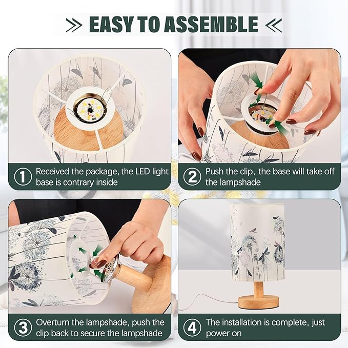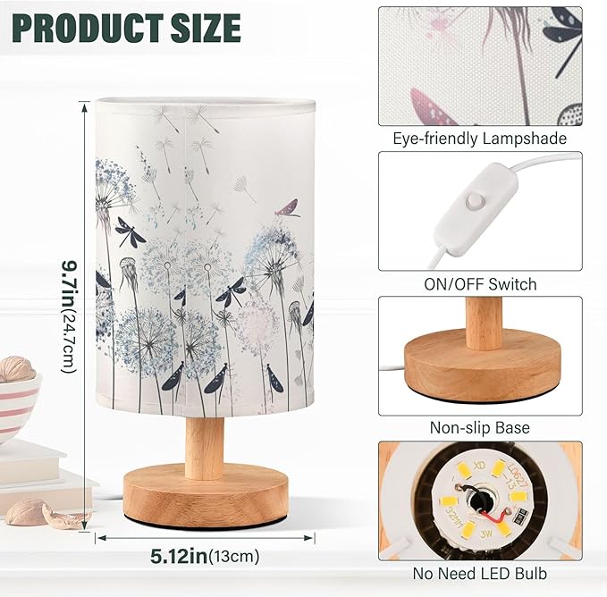 Table Lamp Elegant Dandelion Dragonfly Nightstand Lamp with Wood Base Fabric Lamp Shade Bedside Desk Lamp for Living Room Bedroom Kids Room Office