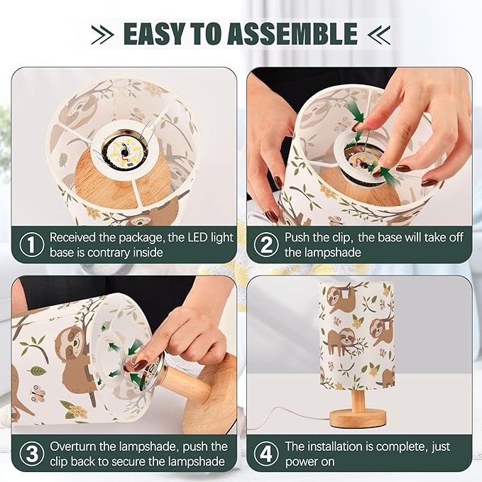 Table Lamp Cute Sloth Butterfly Floral Tree Pattern Nightstand Lamp with Wood Base Fabric Lamp Shade Bedside Desk Lamp for Living Room Bedroom Kids Room Office