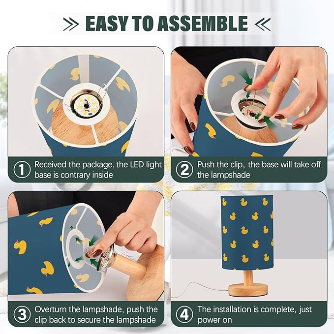 Table Lamp Yellow Duck Pattern on Dark Blue Nightstand Lamp with Wood Base Fabric Lamp Shade Bedside Desk Lamp for Living Room Bedroom Kids Room Office