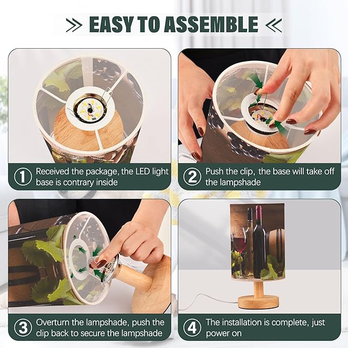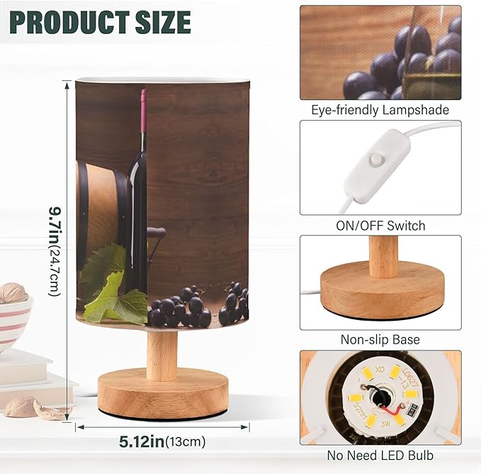 Table Lamp Red and White Wine in Glass Fruit Grape on Wooden Nightstand Lamp with Wood Base Fabric Lamp Shade Bedside Desk Lamp for Living Room Bedroom Kids Room Office
