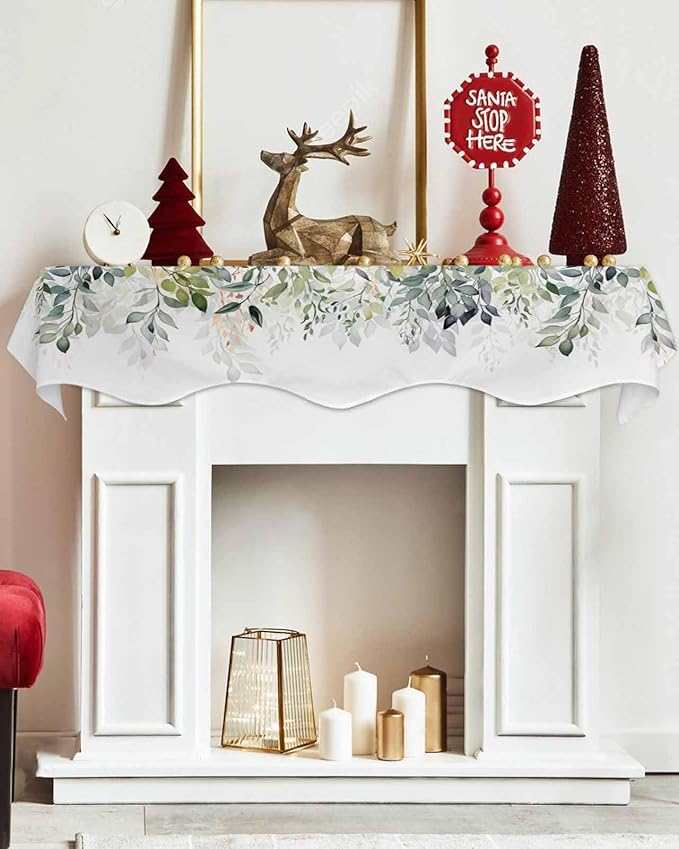• Green Eucalyptus Leaves Mantel Scarf Size: Mantel scarf for fireplace is 60x17 inches. The spring leaves fireplace scarf for winter is designed fresh sage green eucalyptus leaves element, which are classic and elegant, and can enhance the holiday atmosphere