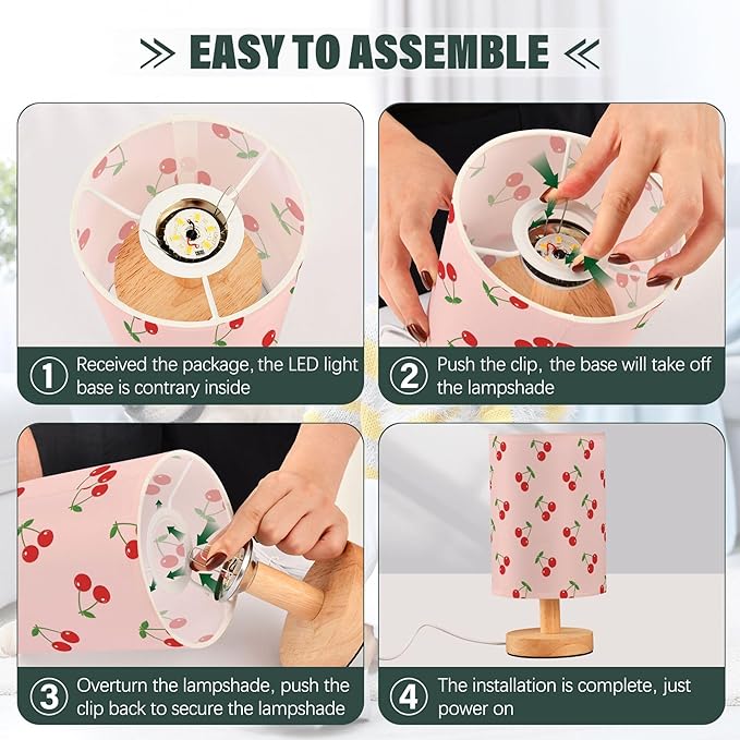 Table Lamp Pretty Cherry Pattern on Pink Nightstand Lamp with Wood Base Fabric Lamp Shade Bedside Desk Lamp for Living Room Bedroom Kids Room Office