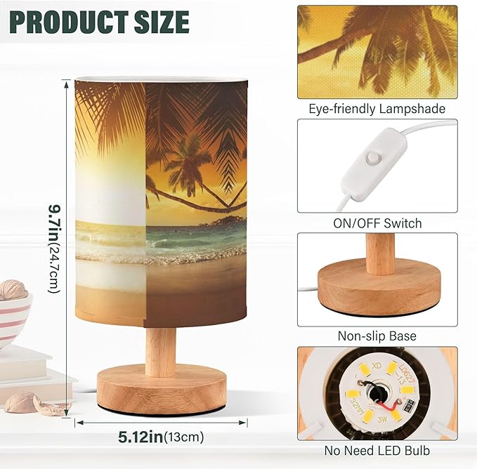 Table Lamp Pretty Sunset Ocean Beach with Palm Tree Caribbean Sea Nightstand Lamp with Wood Base Fabric Lamp Shade Bedside Desk Lamp for Living Room Bedroom Kids Room Office