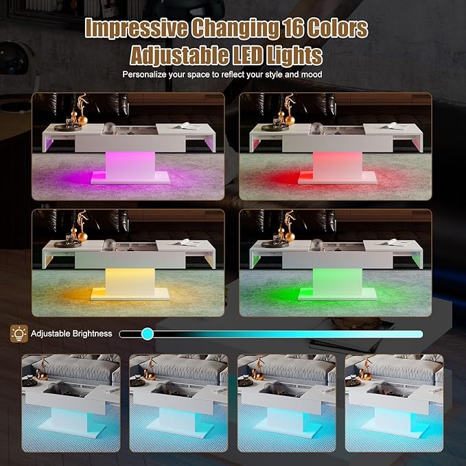 LED Coffee Table with Storage for Living Room, Living Room Table Rectangular Center Table, Modern High Glossy Wooden Coffee Tables with 16 Colors LED Lights for Dining Reception Room, White