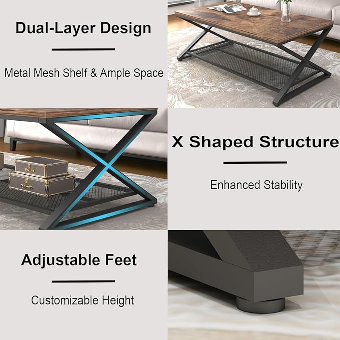 LVB Rustic Coffee Table with Storage, Industrial Wood Metal 2 Tier Center Living Room Table with Mesh Shelf, Farmhouse Wooden Low Rectangle Cocktail Tea Table for Office Bedroom, 47 inch, Rustic Brown