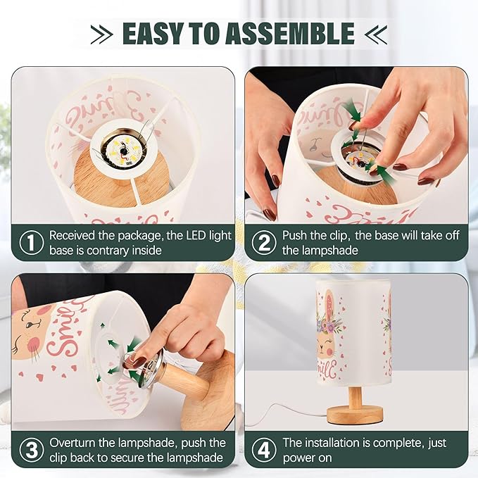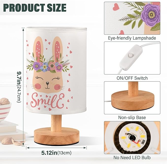 Table Lamp Easter Bunny in Floral Wreath Heart Nightstand Lamp with Wood Base Fabric Lamp Shade Bedside Desk Lamp for Living Room Bedroom Kids Room Office