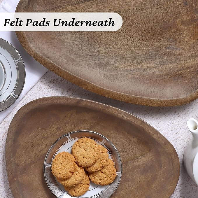 2 Pack Rustic Wooden Serving Tray - Oval Handcrafted Decorative Tray with Felt Base - Coffee Table, Bathroom Vanity, Kitchen Counter Organizer 12 & 14 Inches (Brown)- CLEENTABLE