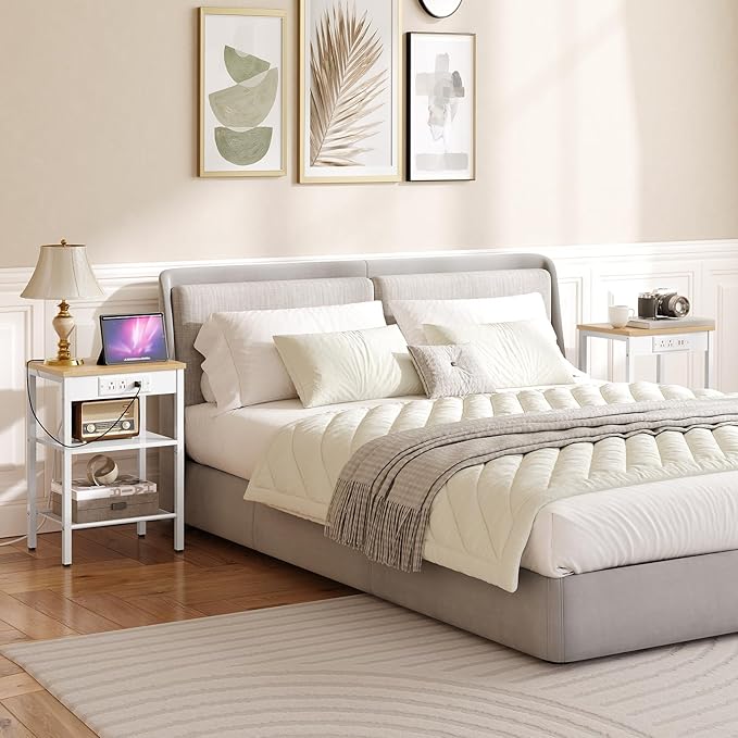 HOOBRO Side Table with Charging Station and USB Ports, Small End Table for Small Space, 3-Tier Nightstand with Adjustable Shelf, for Living Room, Bedroom and Balcony, Natural and White WN112BZ01