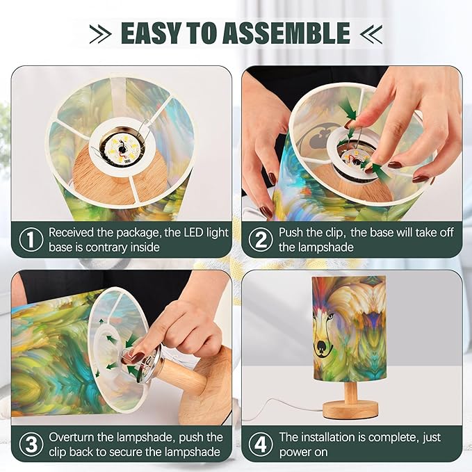 Table Lamp Colorful Dog Paint Portrait Nightstand Lamp with Wood Base Fabric Lamp Shade Bedside Desk Lamp for Living Room Bedroom Kids Room Office