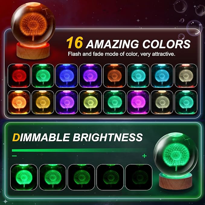 • 🏵️【Unique Design】Our Dandelion Crystal Ball Light features a 3.15-inch diameter crystal ball with a wooden base, creating a stunning and elegant look. The delicate dandelion design adds a touch of natural beauty to any space.
