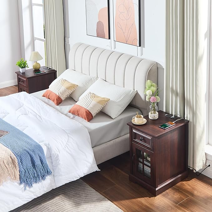 • 🌈【Nightstand with Drawer and Glass Door Storage】This bedroom side table has a Drawer and Glass Door Storage, Which can hold a lot of personal items and less frequently used items, helping you organize the items in the small space! This Side Table with Charging Station can hold common items such as decorations, cell phones, books, record players, etc.