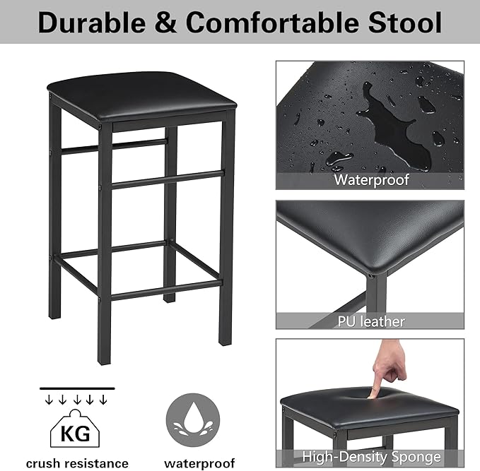 • Space-saving: Stool seat is padded with sponge and covered with PU leather,can be tucked under the high table to save space.The table and chair panel is waterproof and easy to clean, all you need to do is just wipe it with a damp cloth.