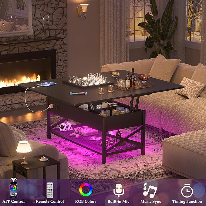 Aheaplus Coffee Table Lift Top Multi-Function Coffee Table Converts to Dining Table, with LED Light and Power Outlet, Center Table with Shelves for Living Room Reception Home Office, Black