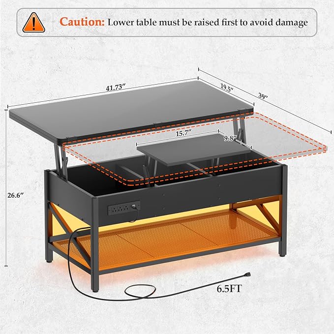 • 【Ample Storage and Sturdy Constructions】The lift-top surface hides 3 storage areas and 1 open shelf. Additional open shelf provides the perfect place for you to display exquisite decorations. Expand your available storage space. With a high-quality metal support mechanism, wooden construction, X Support and rigid metal frame, durable, stable, and won't shake or tilt during use. Fully expanded size: 42" x 39" x 26.6''. Caution: Lower table must be raised first to avoid damage.
