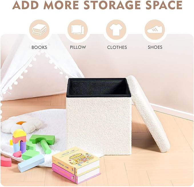 B FSOBEIIALEO Small Storage Ottoman Cube Sherpa Ottomans Foot Rest, Foldable Boucle Ottoman, Faux Teddy Fur, Cream White 15"x15"x15"