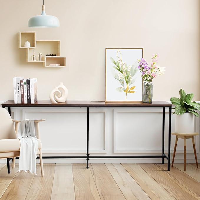 • 【Versatile Home Design】A classic design that complements a variety of décor motifs is paired with a rustic brown wood panel and a black metal frame. The slim sofa table is exquisite and vintage,you can fill it with greenery, decorations, and other items to create a charming nook between the back of the sofa and your wall.